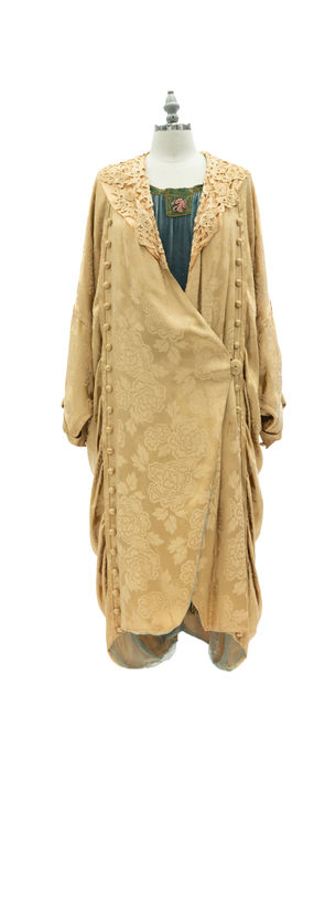 A "coat-dress" in the 1920s referred to a type of coat that resembled a dress, often characterized by its loose, flowing silhouette and long length. These coats were typically designed to be worn over narrower dresses, creating a "coat-dress" look with a distinct silhouette.