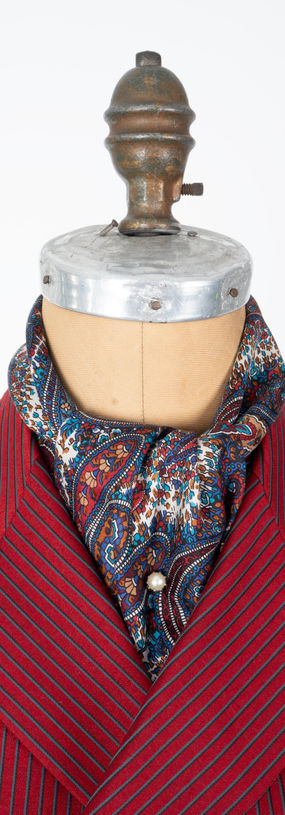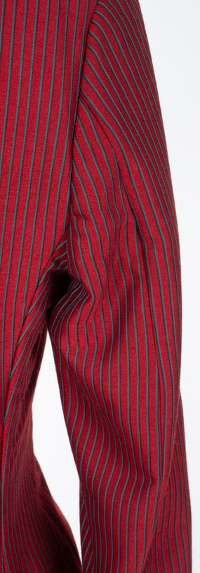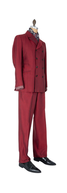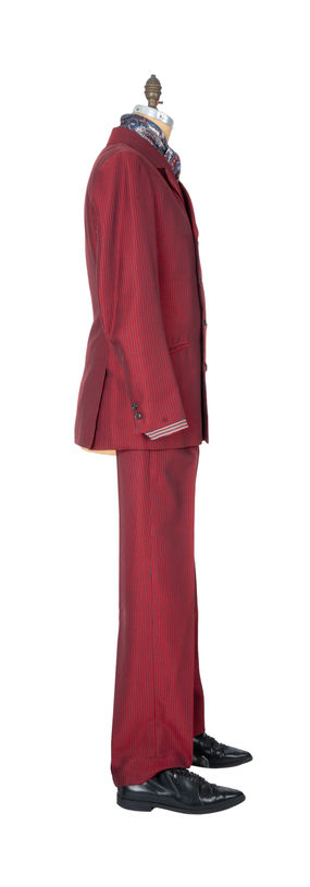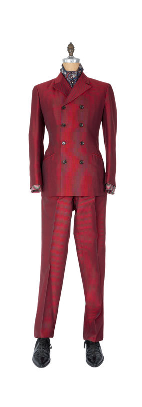 This striking men's double-breasted pinstripe suit from the 1960s Mod era, crafted in a deep crimson red, is tailored to create a sharp and fitted silhouette that flatters the wearer. The subtle yet sophisticated pinstripe pattern adds visual interest, while the double-breasted design enhances the suit’s classic elegance. This ensemble embodies the vibrant, modern aesthetic of its time, skillfully merging traditional tailoring with the youthful and rebellious spirit of the Mod subculture. It makes a bold statement and captures the essence of an era defined by creativity and self-expression.